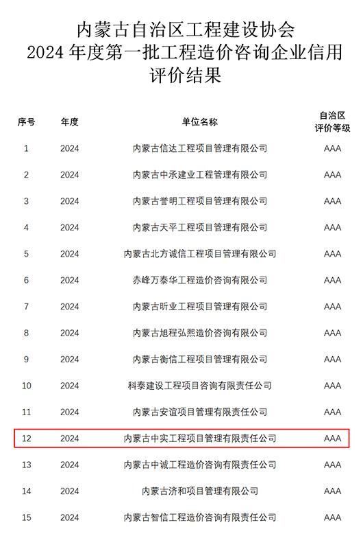 2024-07-3014541 次近期,我公司参加内蒙古自治区工程建设协会组织的“2024年度第一批工程造价咨询企业信用”申报,获得“信用AAA级证书”。我公司成立多年以来,遵循中国工程造价管理协会对造价咨询企…